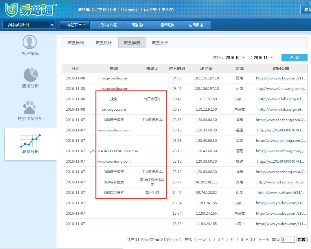 鑫業(yè)機(jī)械關(guān)鍵詞與流量分析【通過(guò)分析我們可以方便的看到每天有沒(méi)有搜索您的關(guān)鍵詞】(如上圖)