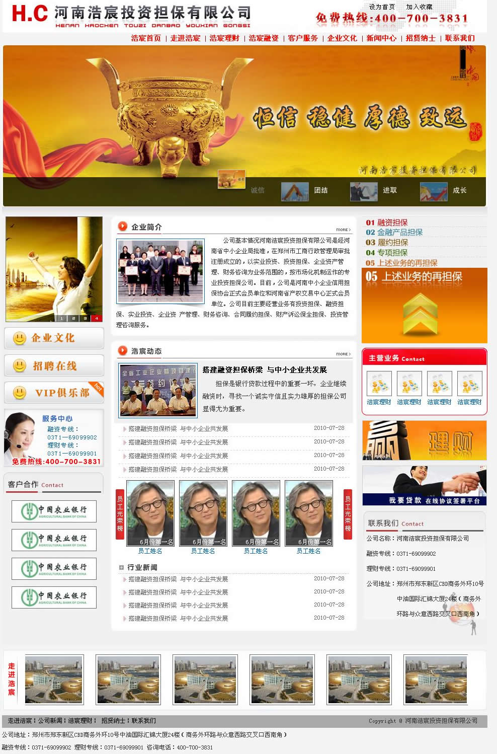 河南浩宸投資擔保有限公司是經河南省中小企業(yè)局批準,在鄭州市工商行政管理局審批注冊成立的,以實業(yè)投資、投資擔保、企業(yè)資產管理、財務咨詢?yōu)闃I(yè)務范圍的,按市場化機制運作的專業(yè)投資擔保公司。目前,公司是河南中小企業(yè)信用擔保協會正式會員單位和河南省產權交易中心正式會員單位。公司目前主要經營業(yè)務有投資擔保、融資擔保、實業(yè)投資、企業(yè)資 產管理、財務咨詢、合同履約擔保、財產訴訟保全擔保、投資管理咨詢服務。網站地址:http://www.hc4007003831.com
