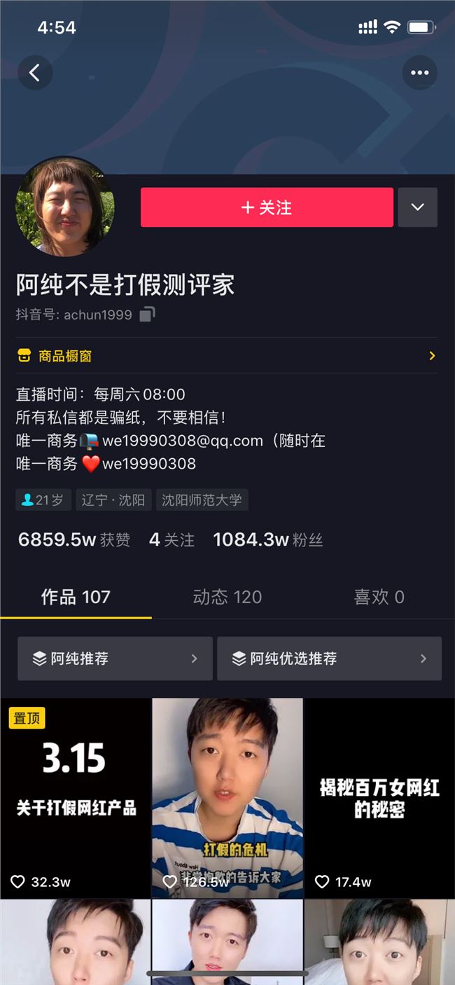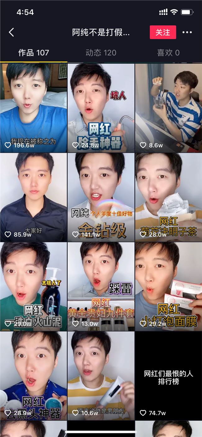 阿純其實很聰明,建立了兩個賬號:一個賬號打假測評,樹立人設(shè);一個賬號變裝獵奇,積累粉絲,為自己的另一個賬號引流。