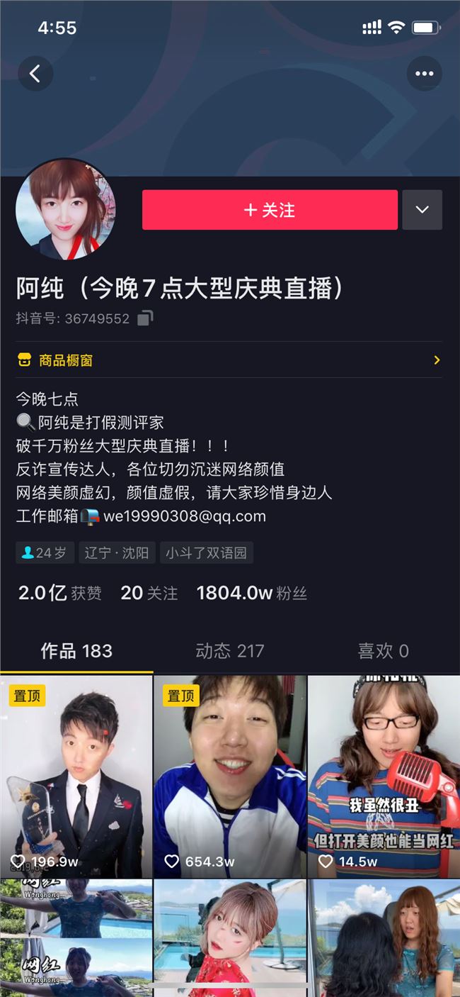 這個賬號主要更新的是阿純換裝的視頻,身高近 190 的阿純在服裝和濾鏡等工具的作用下,秒變“小女生”,巨大的反差斬獲了大量粉絲,截至目前這個賬號的粉絲數(shù)達到了 1800 萬+。