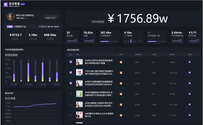 8 月 29 日,阿純的直播GMV達到了1756. 89 萬。其中單價達到 419 的肌底液,單品GMV就達到了229. 7 萬。單價 69 元的洗面奶銷量達到了 5 萬件!