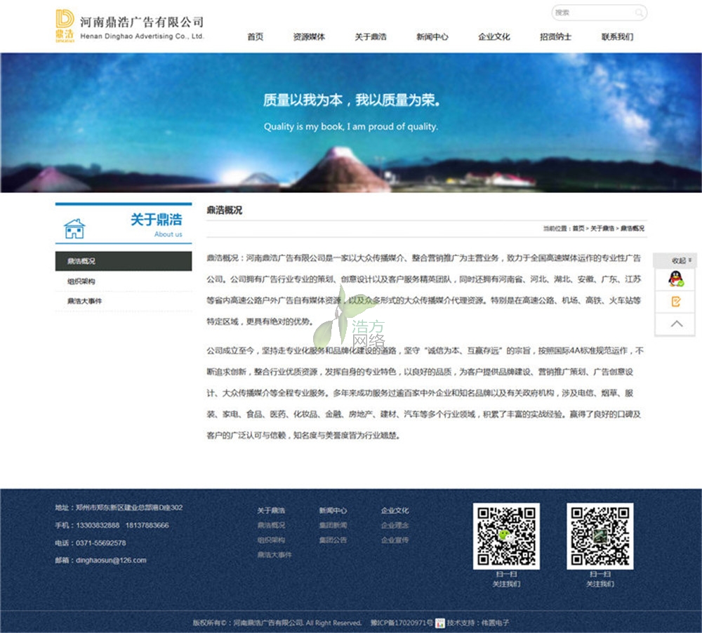 客戶簡介:河南鼎浩廣告有限公司是一家以大眾傳播媒介、整合營銷推廣為主營業(yè)務,致力于全國高速媒體運作的專業(yè)性廣告公司。公司擁有廣告行業(yè)專業(yè)的策劃、創(chuàng)意設計以及客戶服務精英團隊,同時還擁有河南省、河北、湖北、安徽、廣東、江蘇等省內(nèi)高速公路戶外廣告自有媒體資源,以及眾多形式的大眾傳播媒介代理資源。特別是在高速公路、機場、高鐵、火車站等特定區(qū)域,更具有絕對的優(yōu)勢。 公司成立至今,堅持走專業(yè)化服務和品牌化建設的道路,堅守“誠信為本、互贏存遠”的宗旨,按照國際4A標準規(guī)范運作,不斷追求創(chuàng)新,整合行業(yè)優(yōu)質資源,發(fā)揮自身的專業(yè)特色,以良好的品質,為客戶提供品牌建設、營銷推廣策劃、廣告創(chuàng)意設計、大眾傳播媒介等全程專業(yè)服務。多年來成功服務過逾百家中外企業(yè)和知名品牌以及有關政府機構,涉及電信、煙草、服裝、家電、食品、醫(yī)藥、化妝品、金融、房地產(chǎn)、建材、汽車等多個行業(yè)領域,積累了豐富的實戰(zhàn)經(jīng)驗。贏得了良好的口碑及客戶的廣泛認可與信賴,知名度與美譽度皆為行業(yè)翹楚。
